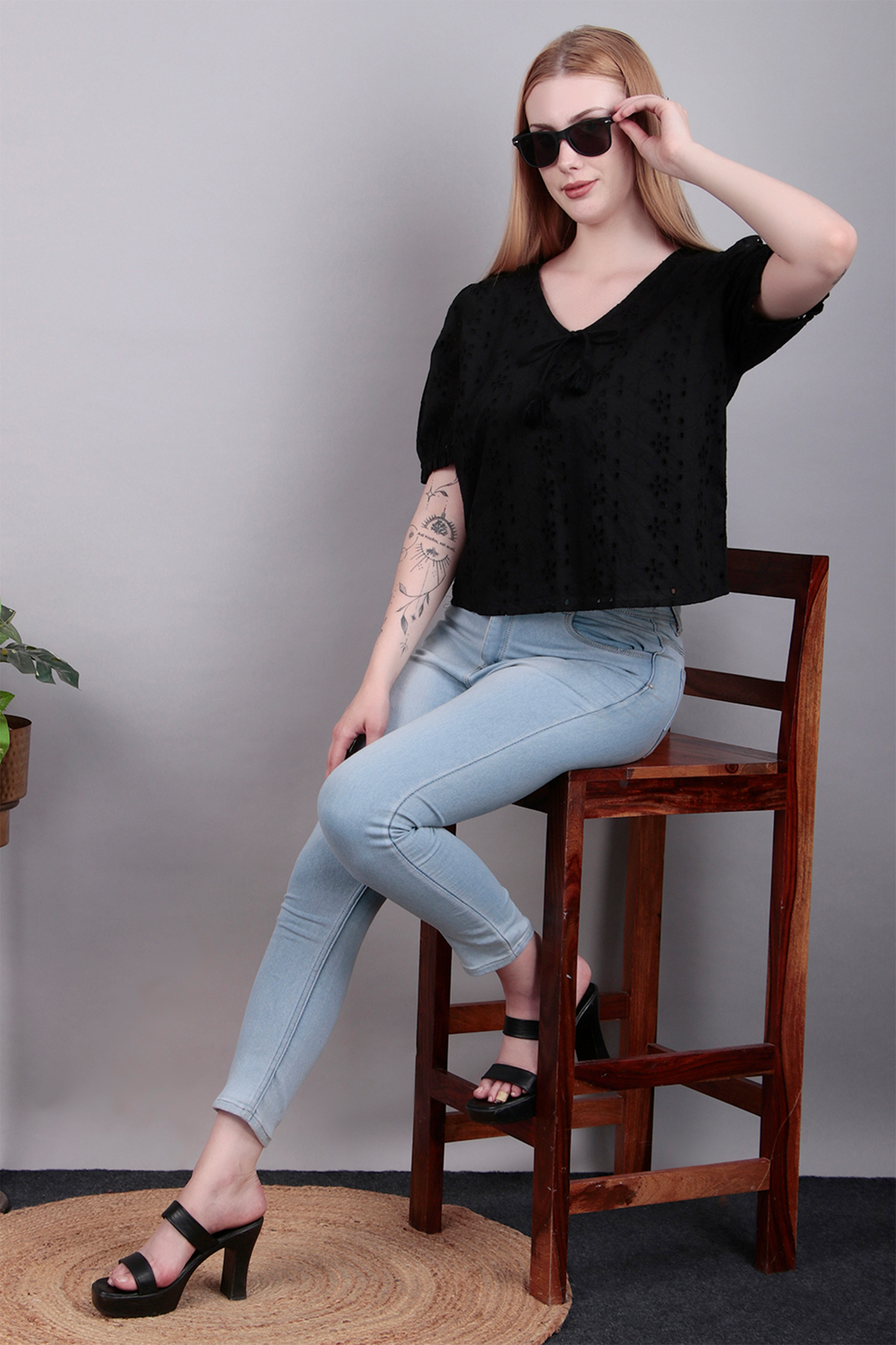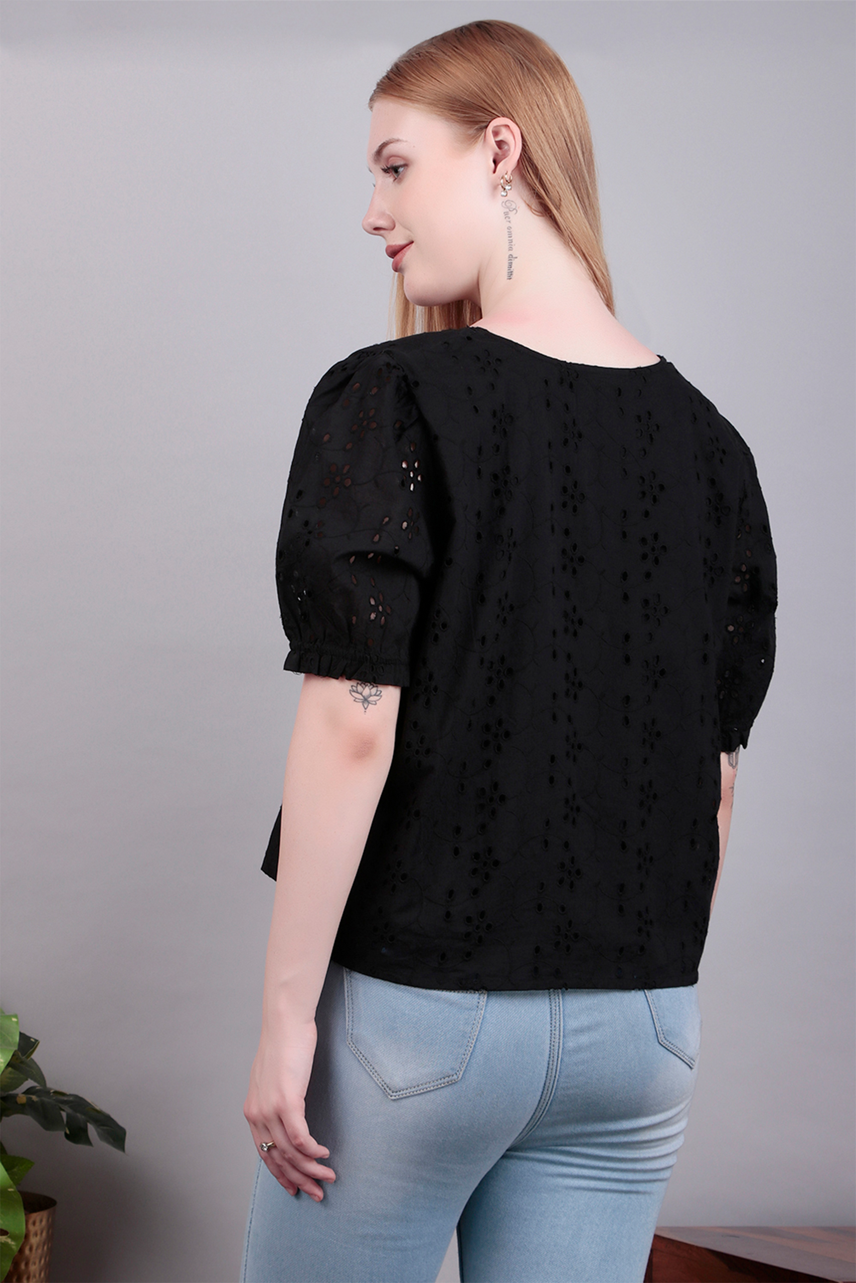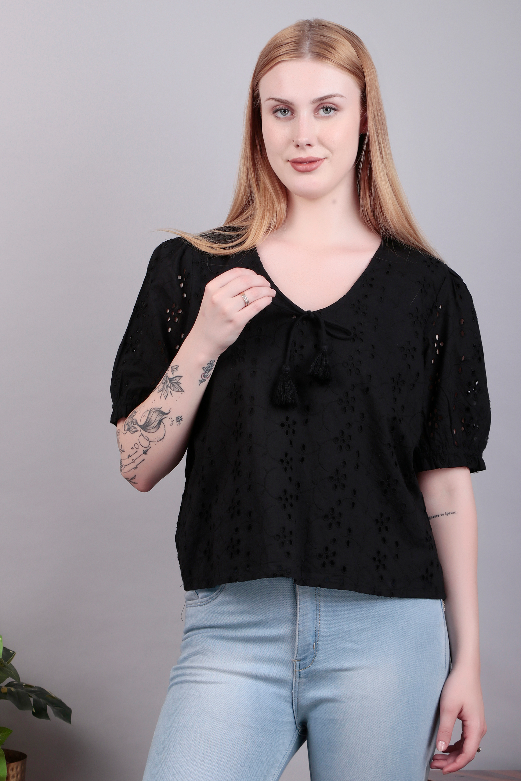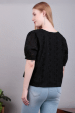 Elevate your wardrobe with this black embroidered top, featuring delicate detailing that adds a refined touch to a timeless silhouette. Perfect for both day and night styling.